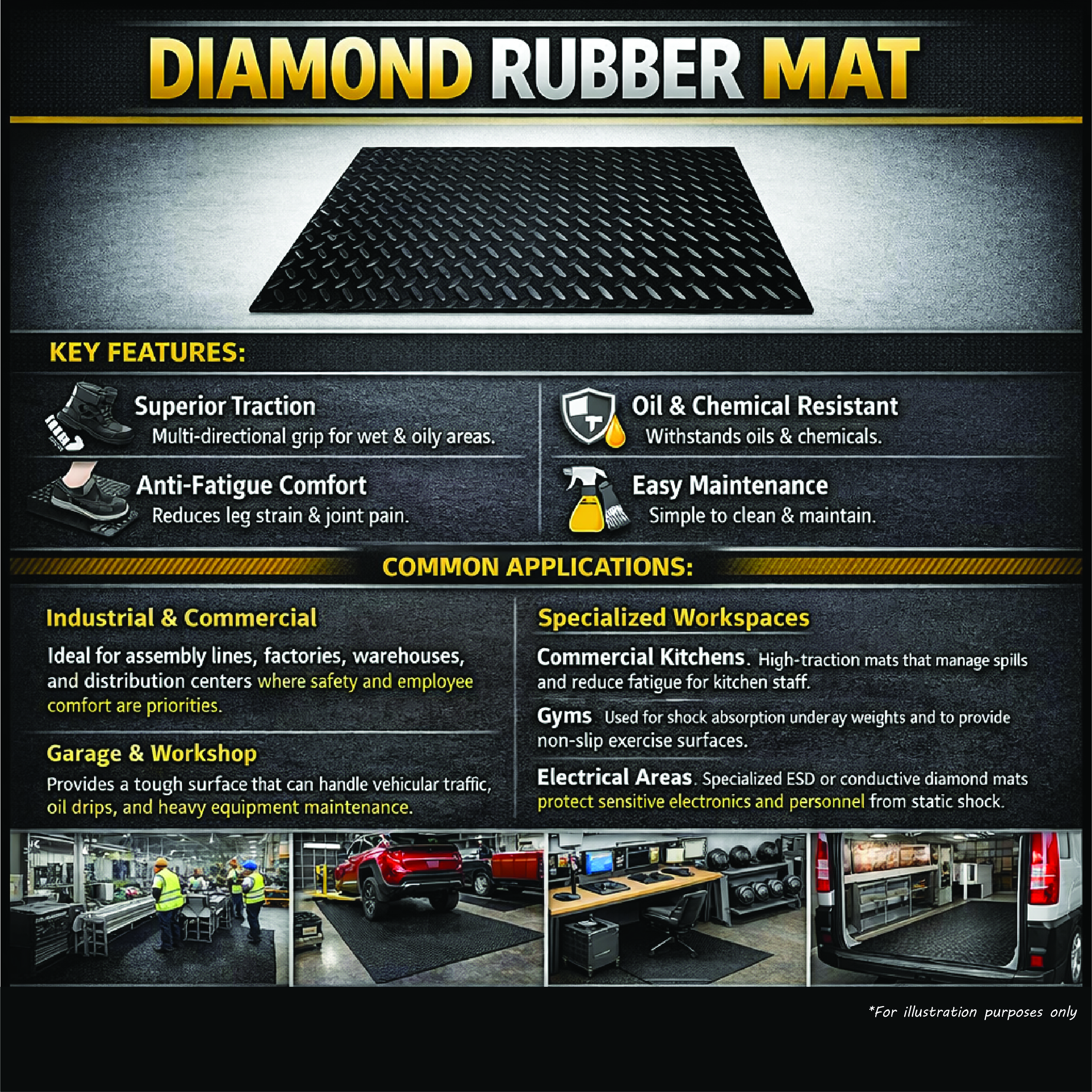 Base flooring can be very vulnerable. Wood and tile can be degraded over time due to a high volume of foot traffic and/or the continued presence of heavy equipment. When these diamond plate floor mats are in place, they absorb the shock and pressure of heavy weights. They take the full force while preventing the surface beneath them from feeling it. If your area contains heavy equipment, floor mat options such as the “Diamond Plate” is essential to have around.