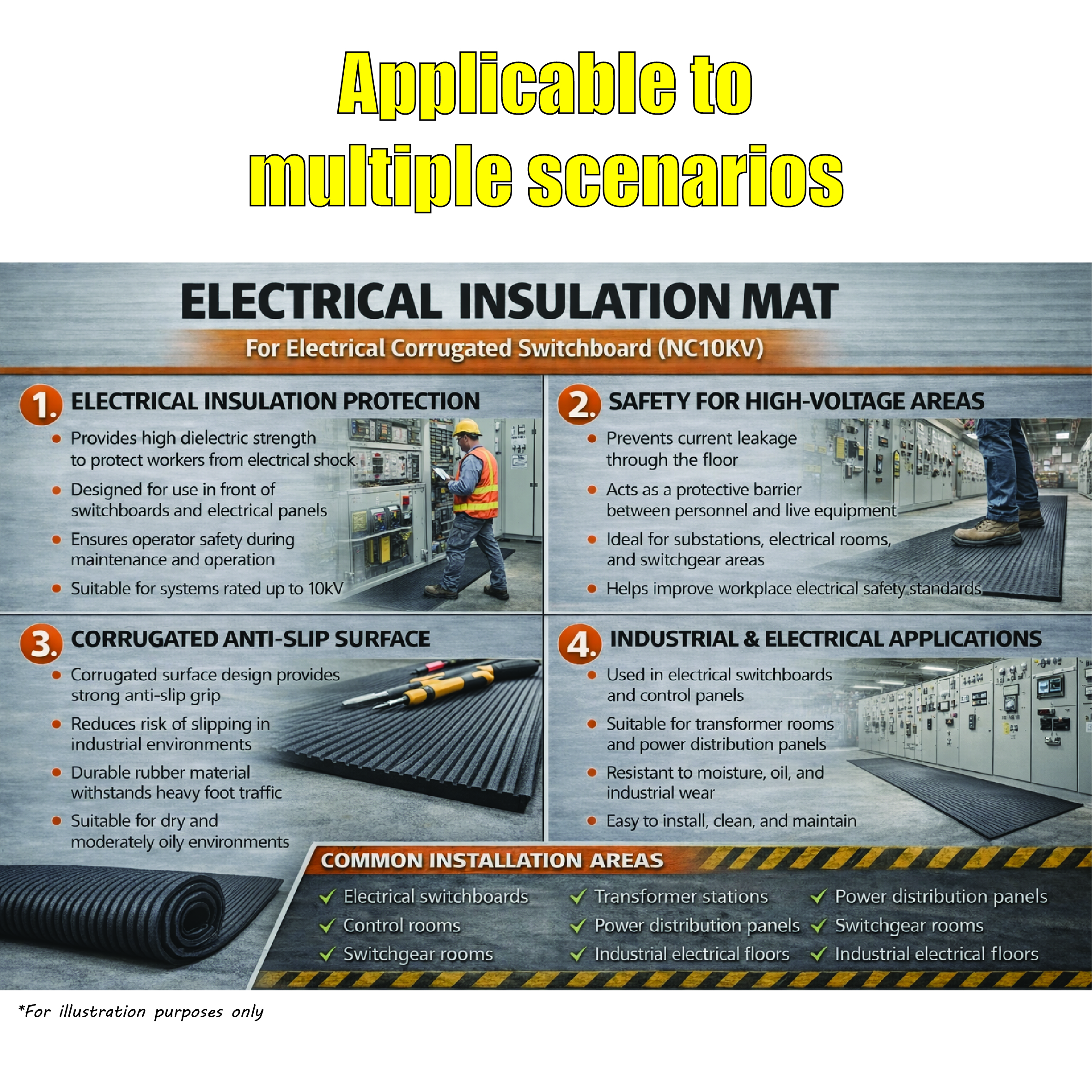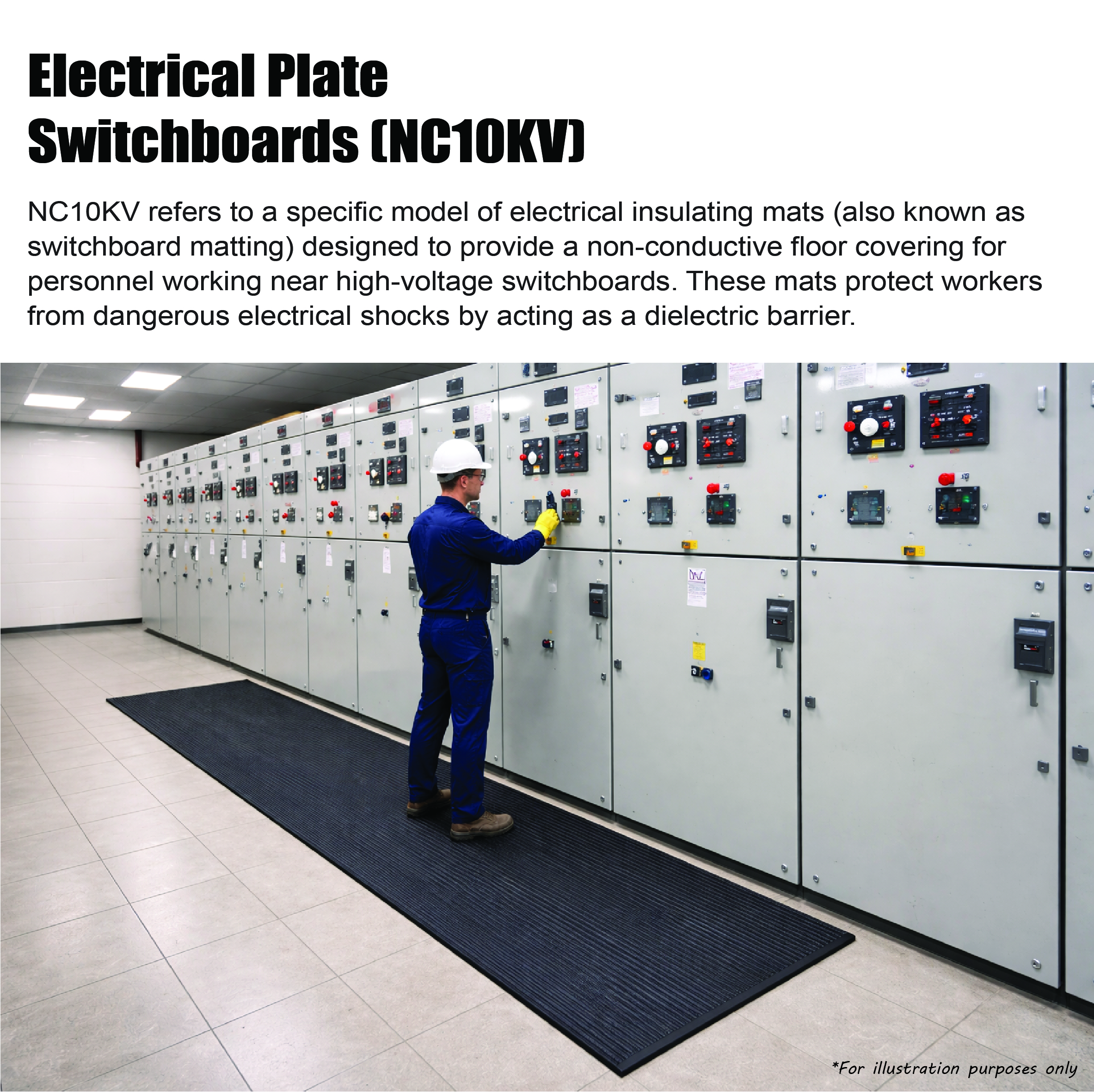 Electrical Insulation mats are made of rubber. Rubber, due to its properties of resistivity, is used in many industrial applications throughout industry to insulate and protect; it is an obvious choice for electrical safety matting and is tested vigorously to ensure the level of protection is met.