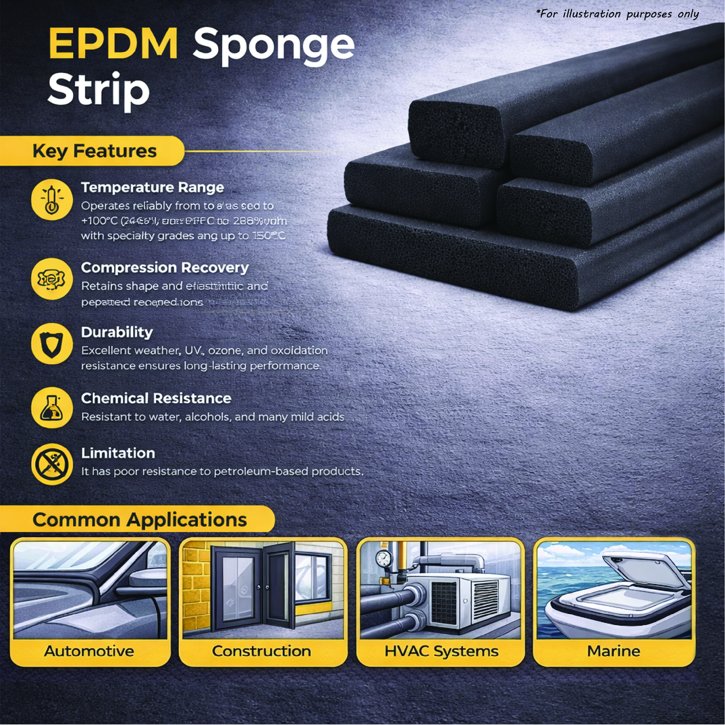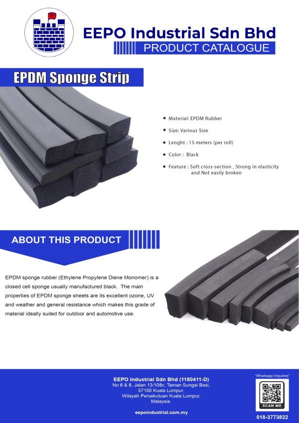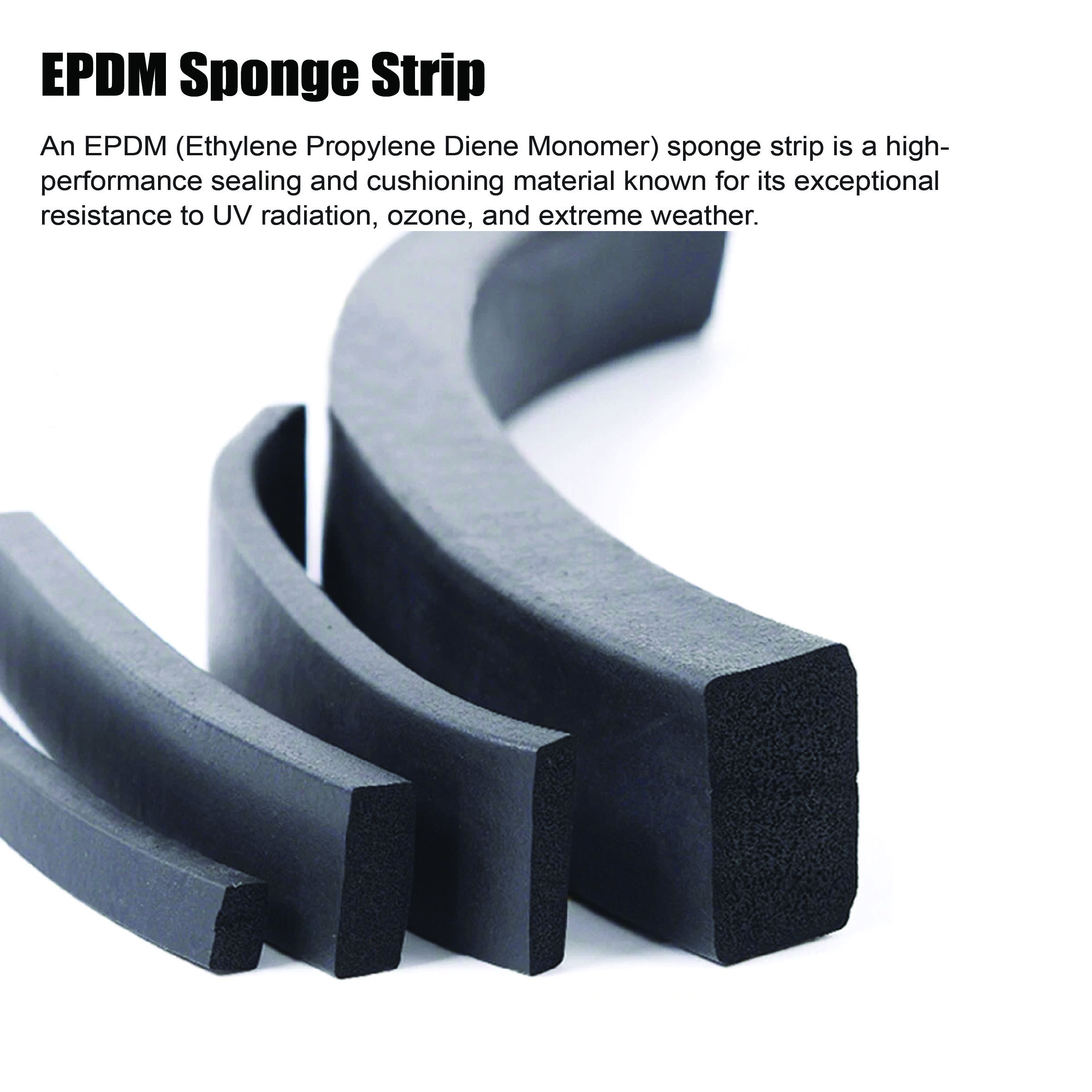 EPDM sponge rubber (Ethylene Propylene Diene Monomer) is a closed cell sponge usually manufactured black.  The main properties of EPDM sponge sheets are its excellent ozone, UV and weather and general resistance which makes this grade of material ideally suited for outdoor and automotive use.