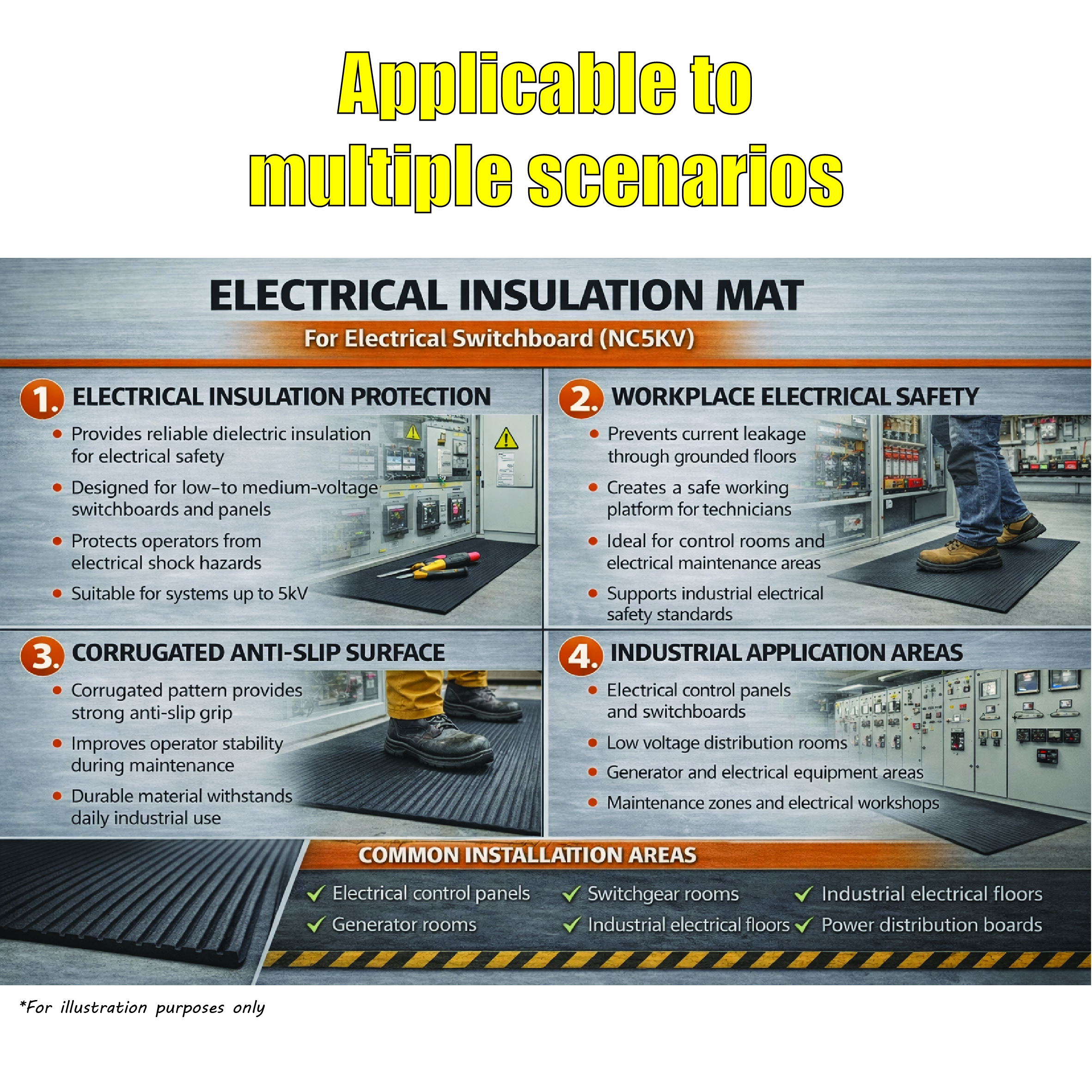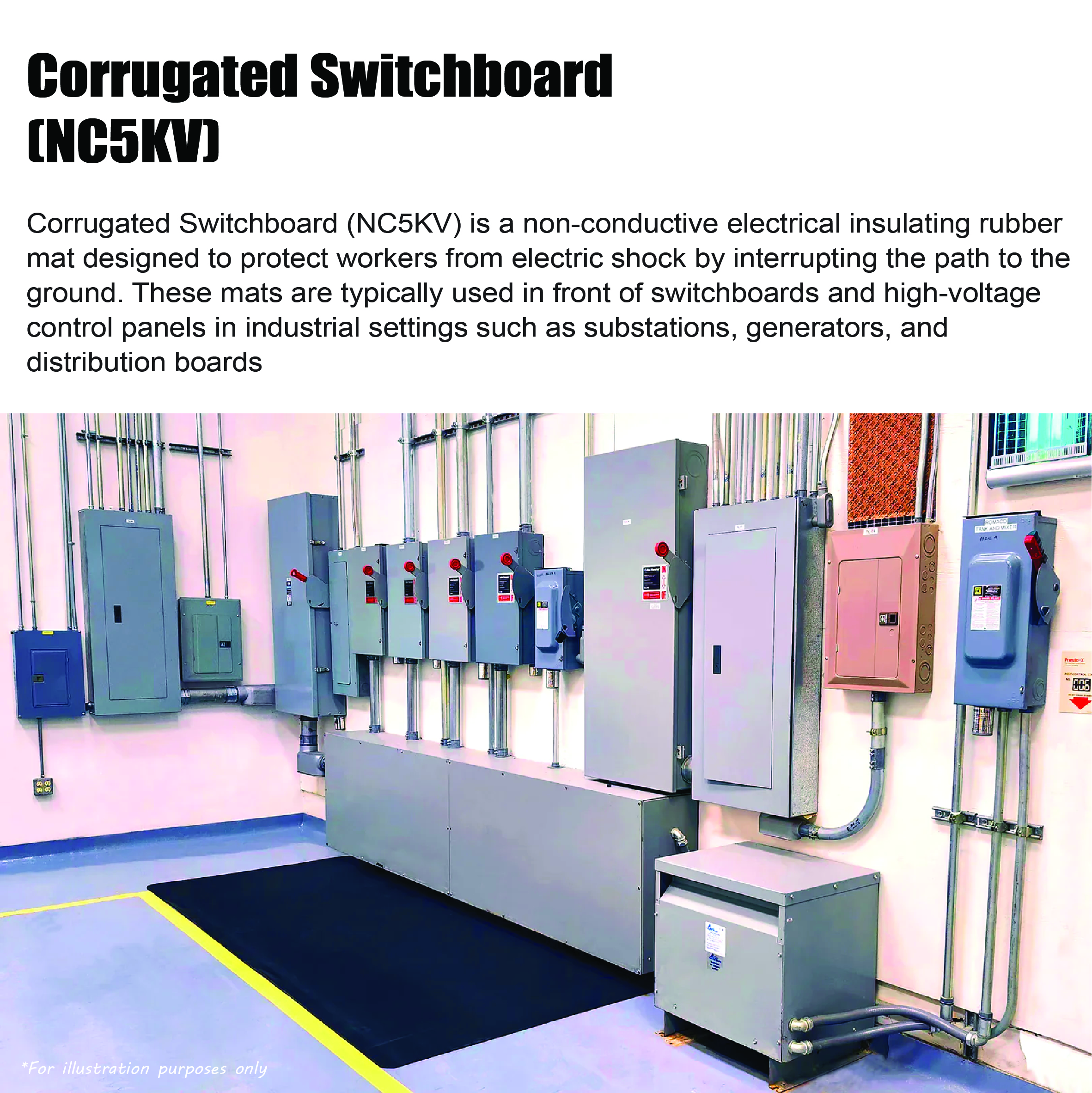 Electrical Insulation mats are made of rubber and due to its properties of resistivity, is used in many industrial applications throughout industry to insulate and protect; it is an obvious choice for electrical safety matting and is tested vigorously to ensure the level of protection is met.