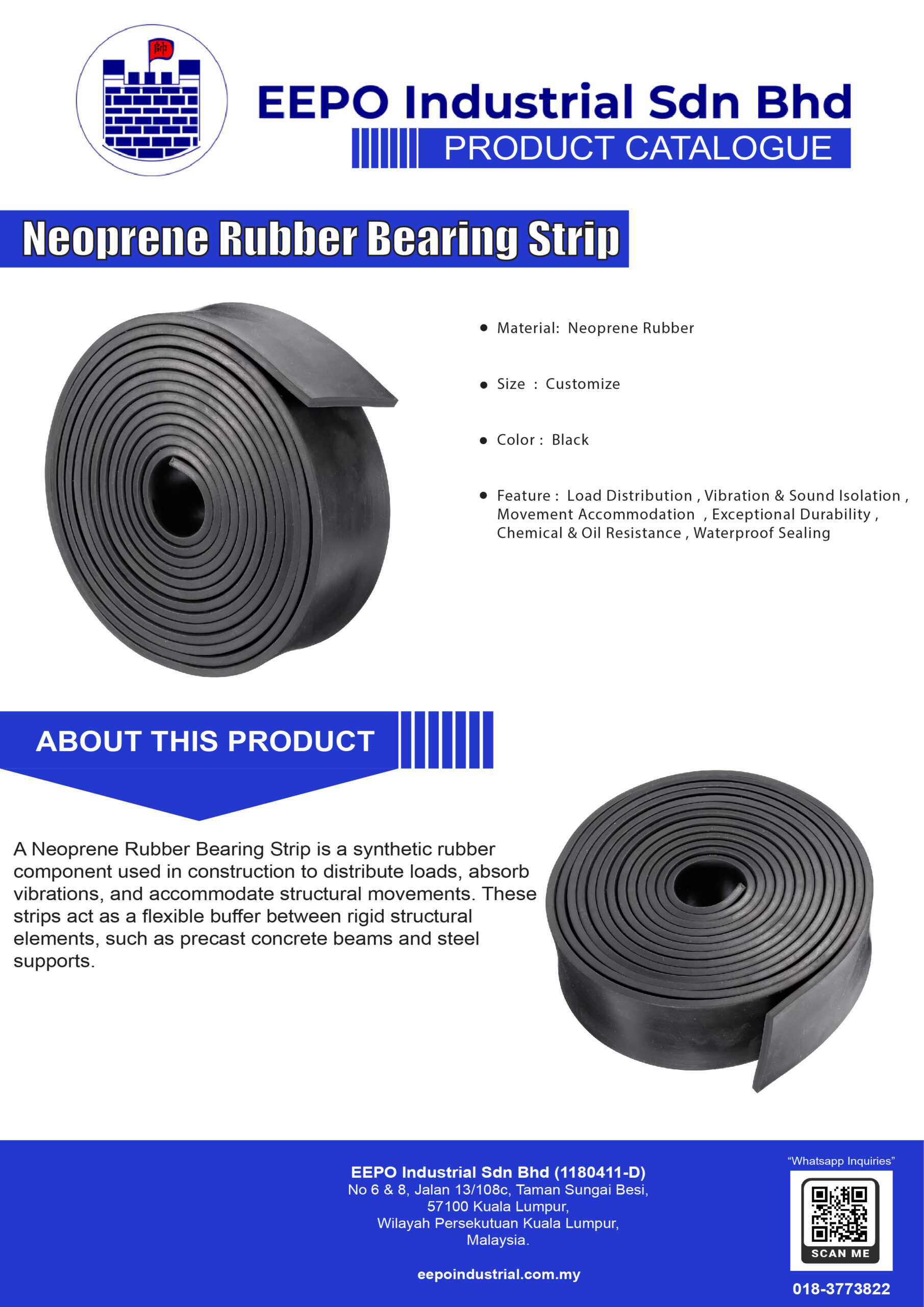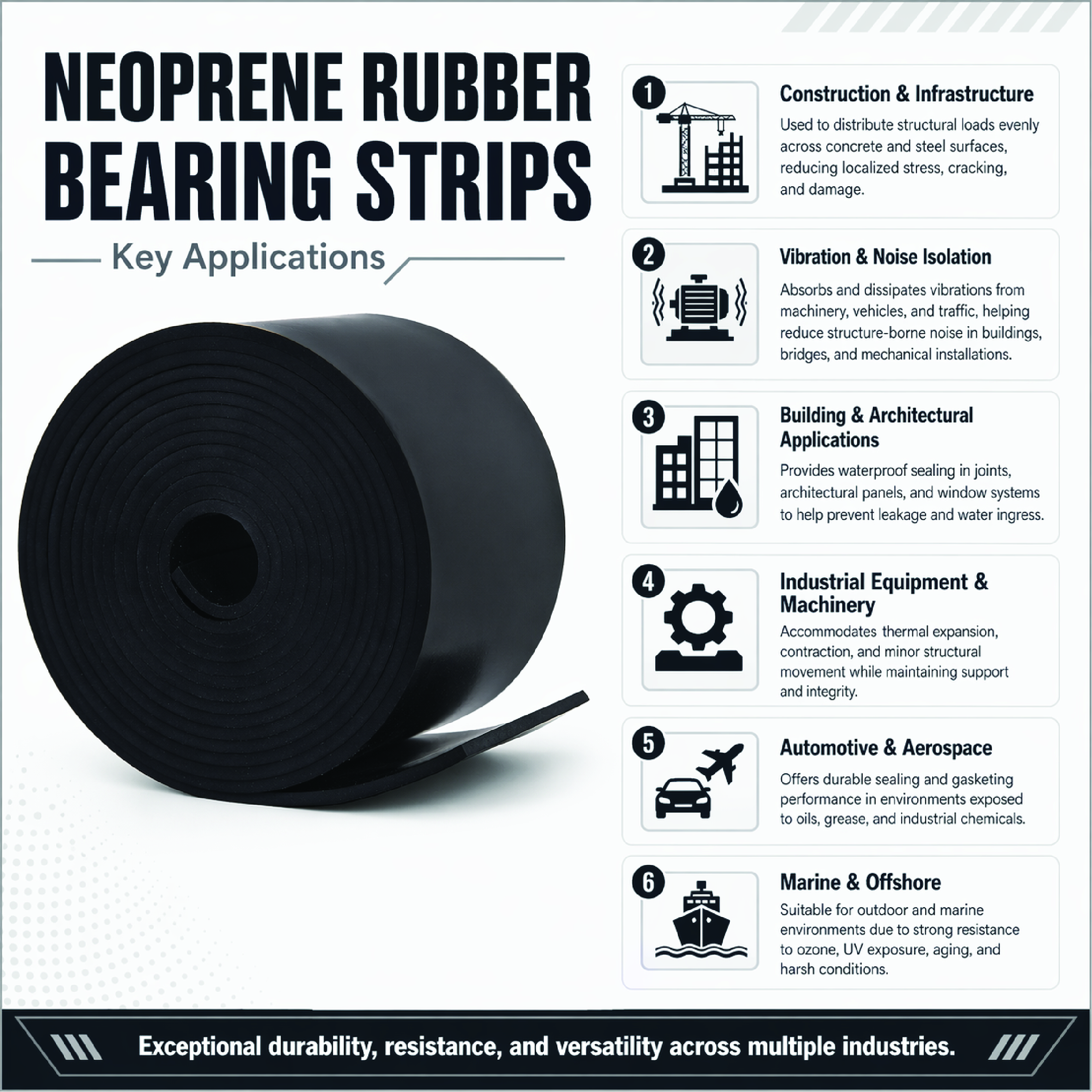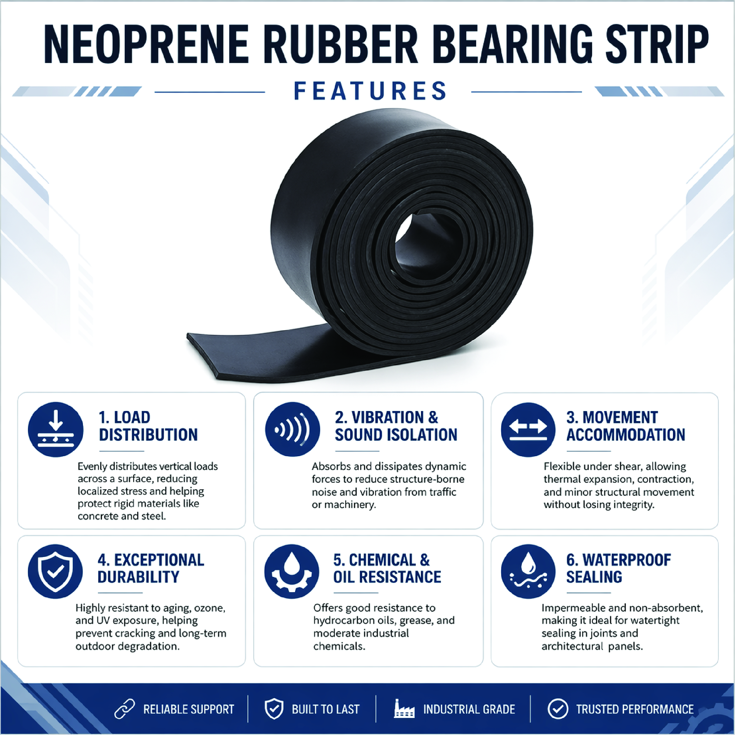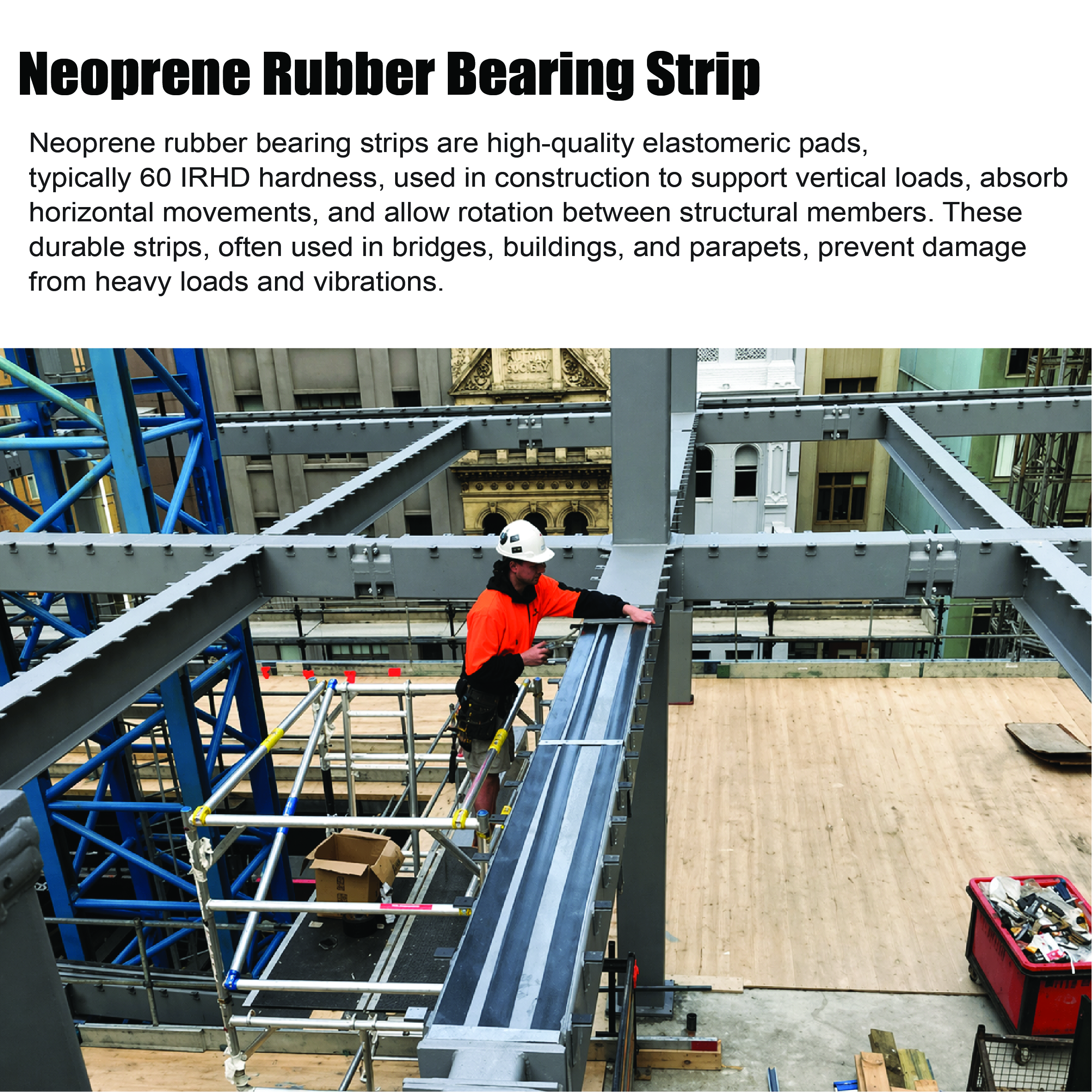 Neoprene rubber bearing strips are high-performance synthetic rubber components used primarily in construction and engineering to support vertical loads, absorb vibrations, and accommodate structural movements. They are manufactured from polychloroprene, a material known for its durability and resistance to harsh environmental conditions.