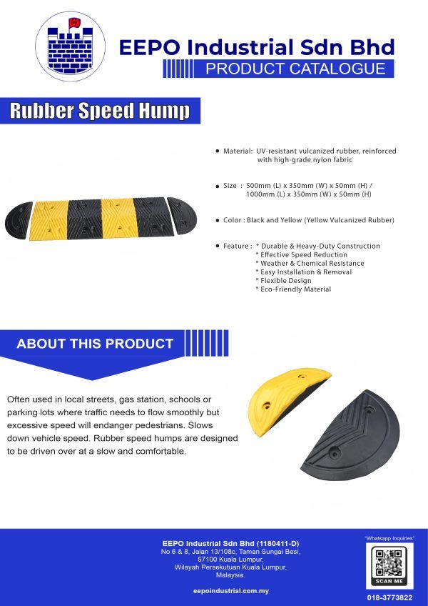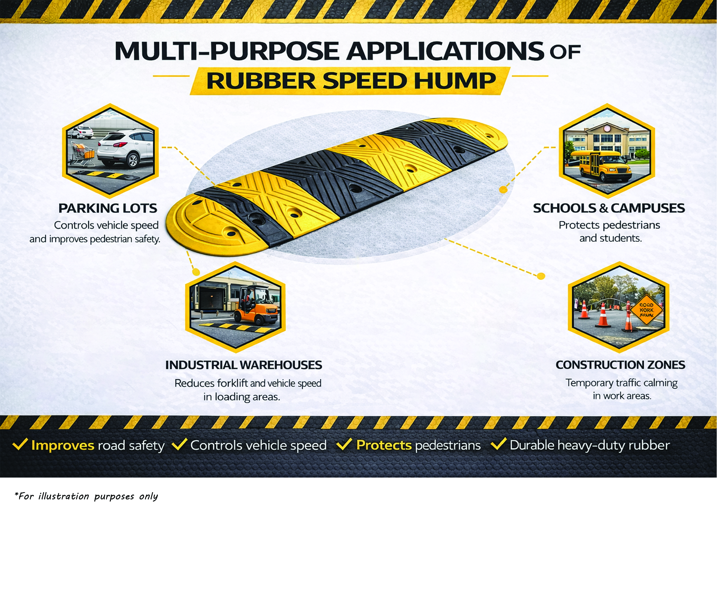 Often used in local streets, gas station, schools or parking lots where traffic needs to flow smoothly but excessive speed will endanger pedestrians. Slows down vehicle speed. Rubber speed humps are designed to be driven over at a slow and comfortable.