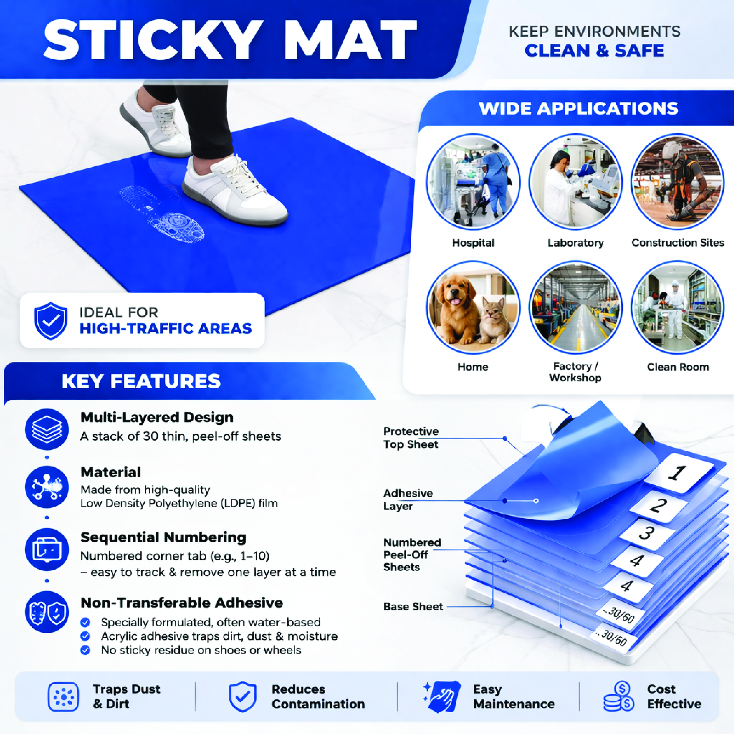 - Made of a polyethylene film material giving a smooth and clean effect to the floor.