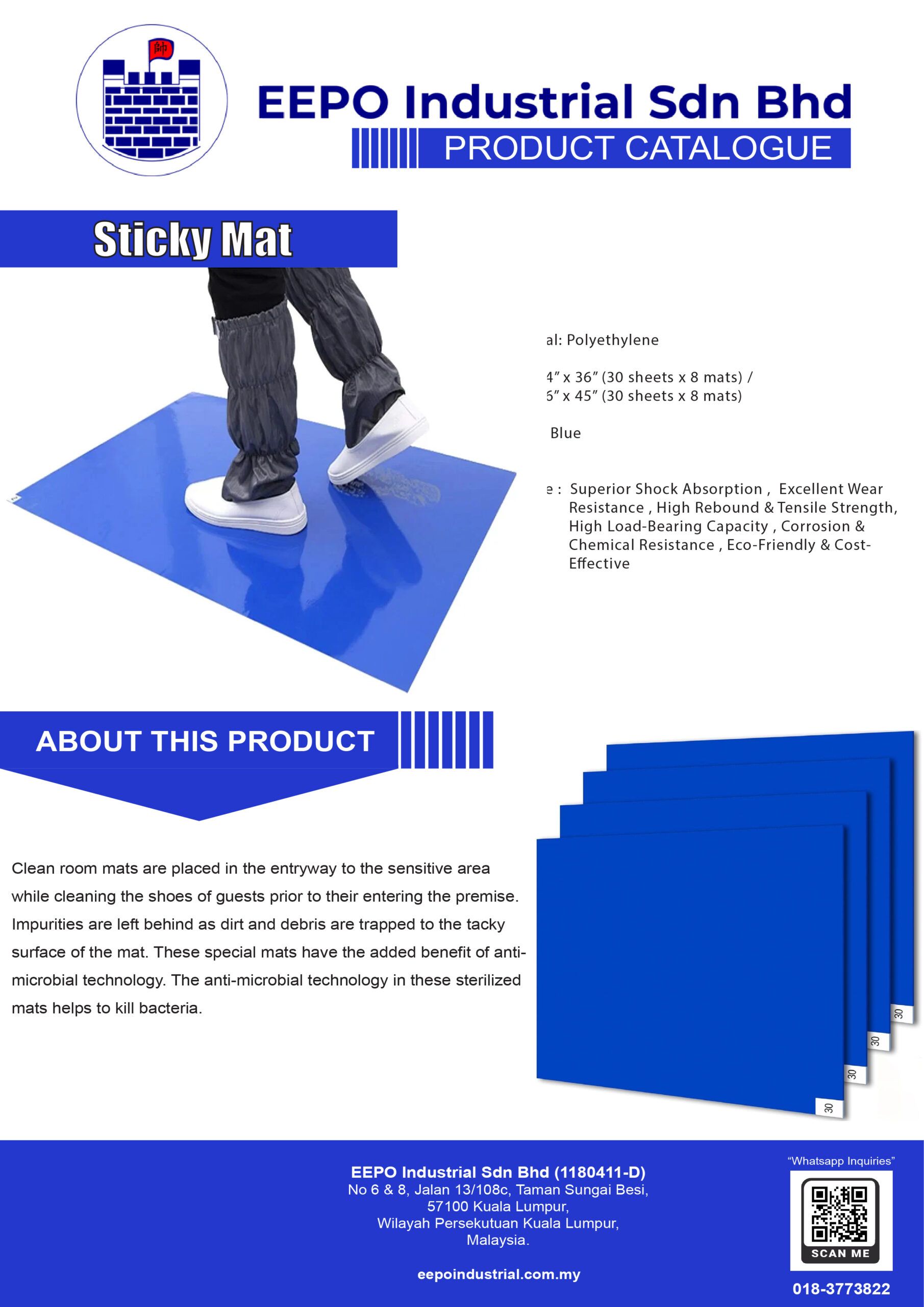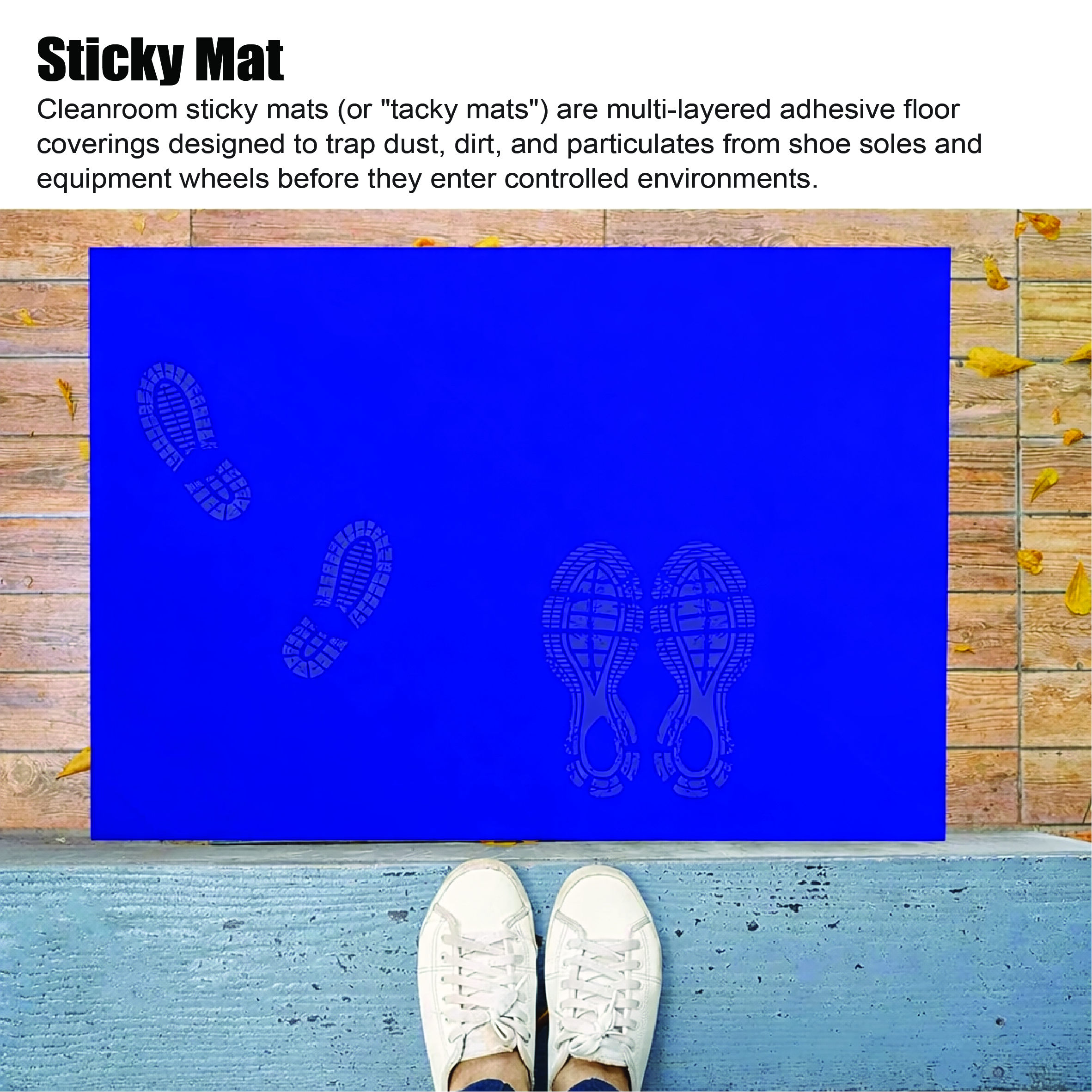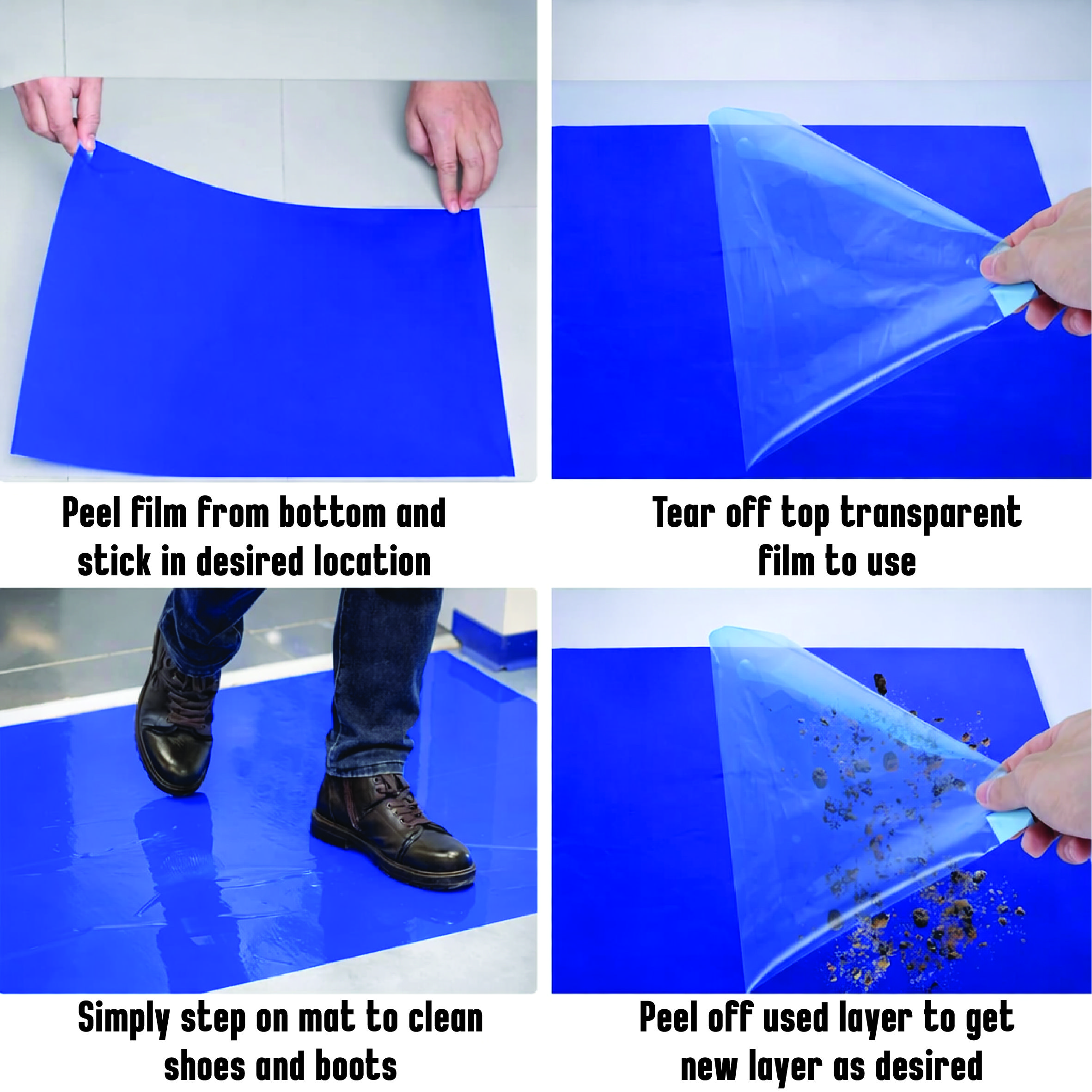 Tacky mats have sticky adhesive, peelable layers, which are designed to remove dirt on contact. The sticky surface of the mat removes over 90% of dirt particles, by capturing it in the adhesive as foot traffic passes over. This amount of dirt is removed from shoes in just two steps.